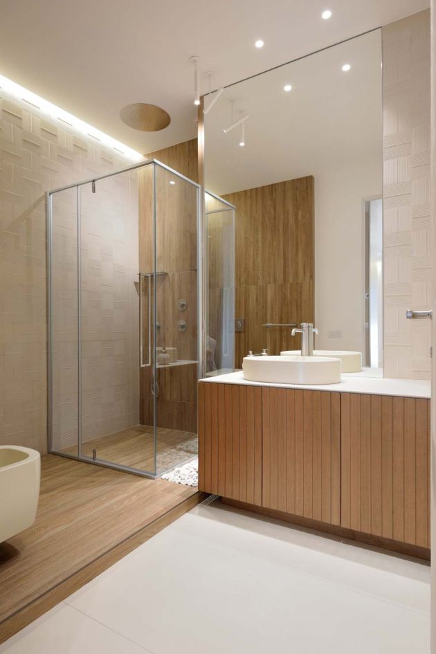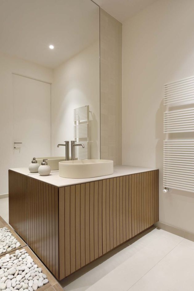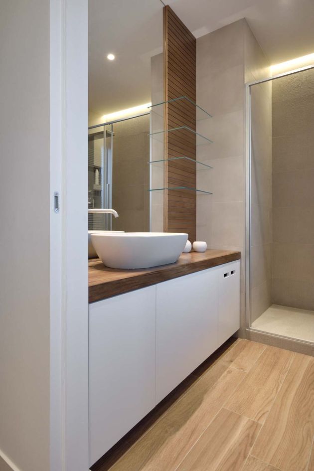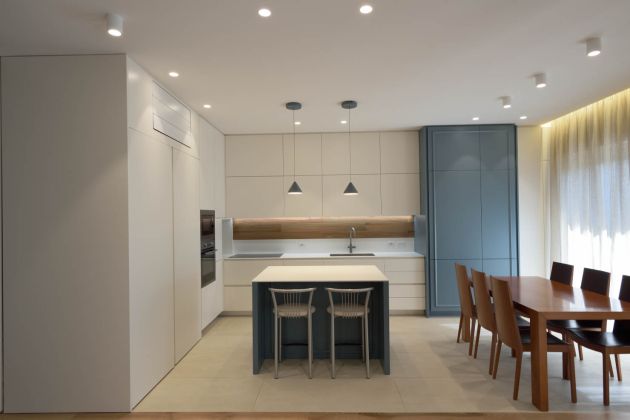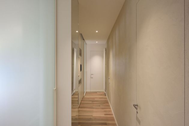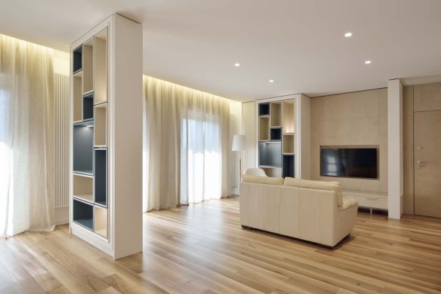 Il progetto di ristrutturazione e restyling di questo appartamento di 110 mq, sito al primo piano di un condominio del quartiere Poggiofranco a Bari, aveva alla base una richiesta ben precisa: trasformare un ambiente cupo e poco illuminato in uno in cui la luce naturale faccia da padrona. Si è pensato di rivoluzionare completamente l'impianto dell'appartamento. In questo modo la suddivisione zona giorno e zona notte ha permesso che tutte le aperture volte ad est illuminino l'intera zona giorno, al contrario la zona notte ed i servizi sono stati disposti nella zona occidentale. Al fine di illuminare la totalità dell'immobile, prevalentemente attraverso la luce solare, si è preferito ridurre al minimo l'uso dei tramezzi adoperati esclusivamente per circoscrivere le zone bagno e ripostigli. L'intero appartamento, dunque, risulta illuminato naturalmente durante l'arco della giornata anche grazie ad un elemento contenitore che separa il living, alternando pieni e vuoti e creando un filo diretto fra est e ovest.
